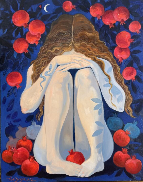 The tension between her fragile posture and the powerful presence of the pomegranates evokes a dialogue between guilt and desire, sin and creation.