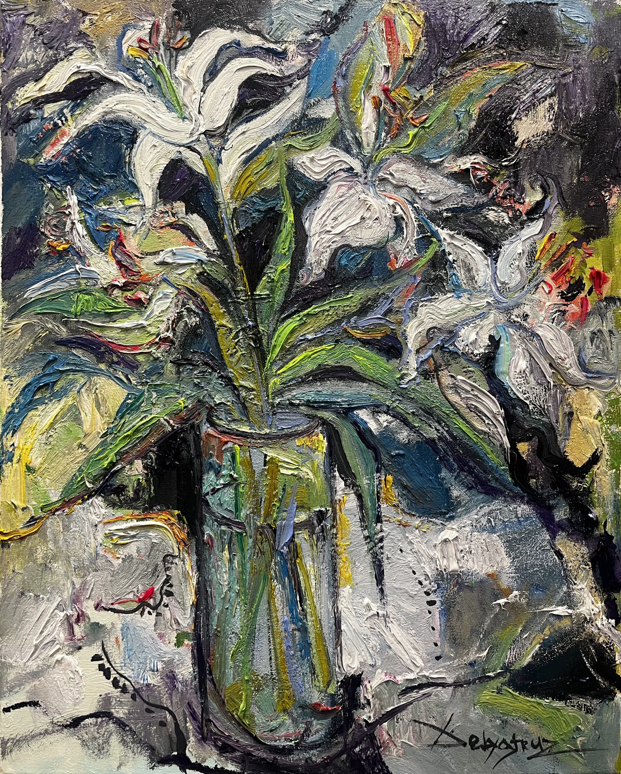 A delicate composition of lilies filled with light and inner calm. The painting conveys a sense of quiet, purity, and refined harmony, bringing softness and depth to any space.