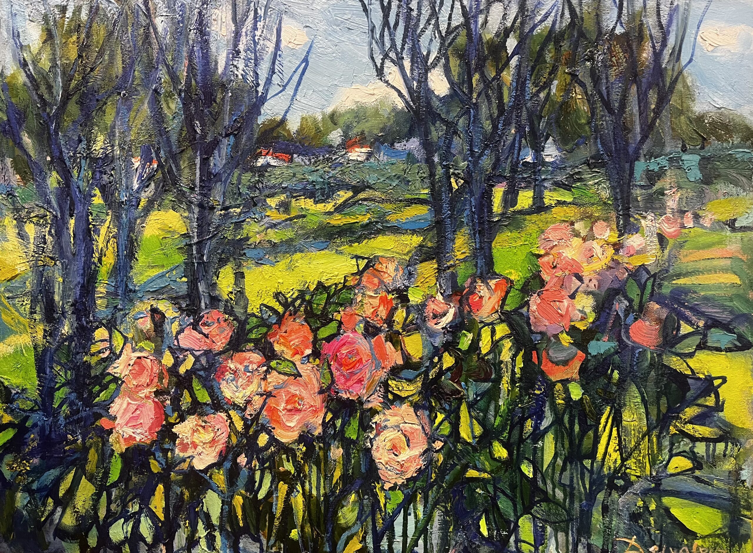 An abstract landscape where trees are just waking from winter, and delicate roses bloom across the field. The abundance of vibrant flowers evokes the freshness, life, and beauty of spring.