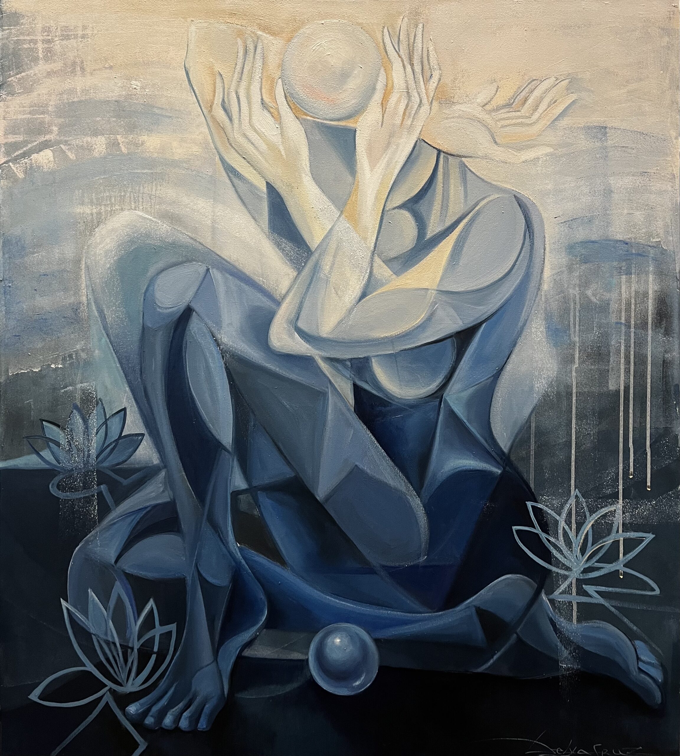 This work portrays a figure who, through meditation and the unveiling of their inner treasure, transcends the physical realm and transforms into pure spirit.